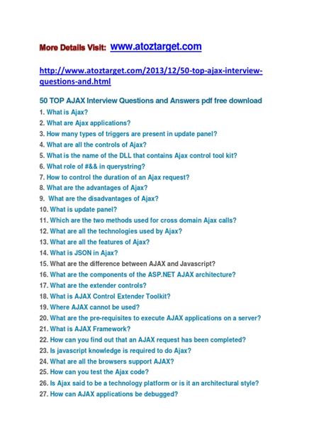 Ajax Interview Questions And Answers For Experienced In C# - Questions & Answers. Ajax uses asynchronous data transfer between the browser and the web server. Here, we have made a list of the top 50 asp.net interview questions along with their answers.