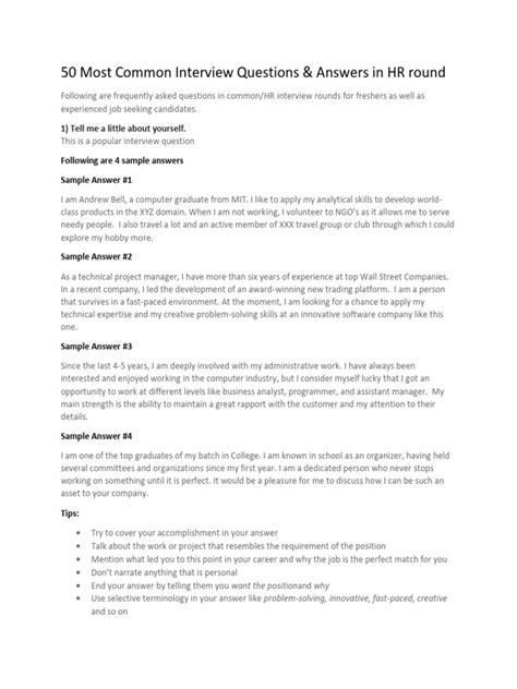 Common Hr Interview Questions And Answers Pdf - Questions & Answers. Free ebook top 32 hr interview questions with answers 1 2. Briefly talk about your current employer.