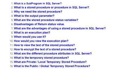 Interview Questions And Answers On Stored Procedure In Sql Server - Questions & Answers. It is a collection of schemas, tables, procedures, code functions, and other objects. They can be invoked by call.