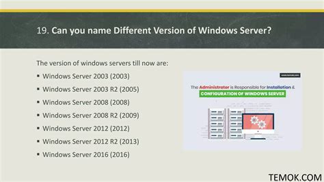 Introduction to server interview questions and answers. The answers to these questions could be very difficult, but at the very least you can rule out if your network card is going bad. The interviewer is looking for answers that align with company values. Prepare examples demonstrating your skills: Top windows server interview questions. Windows cluster interview questions and answers. What are the roles of system administrator? Ad spend valuable time focusing on the best candidates with proven job skills tests. In the context of the registry, how do you define “tattooing”? The three main task of a system admin is installing, supporting and maintaining servers & computers. Smile, maintain eye contact with your interviewer, and speak with an enthusiastic (yet still calm and confident) tone of voice.