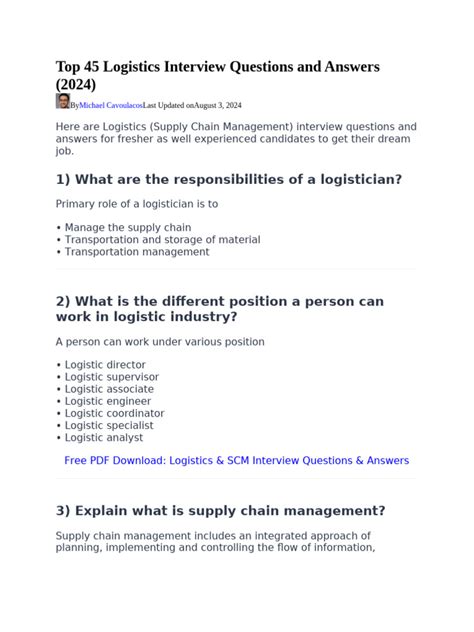Logistics Interview Questions And Answers For Freshers - Questions & Answers. Ask about your role, the company and their industry! 20 sample transport and logistics interview questions.