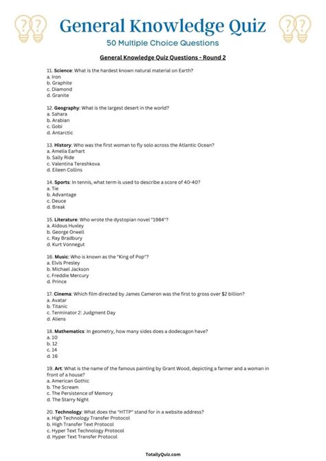 Fully solved examples with detailed answer description, explanation are given and it would be easy to understand. Where can i get general knowledge interview questions and answers (objective type, multiple choice)? No matter what type of things you like and know, you will find something suitable for you here. Multiple choice questions and answers (quiz, mcqs & tests with answer keys) (science quick study guides & terminology notes about everything) by arshad iqbal available from rakuten kobo. This is the reason eiffel tower can be taller during summer. Trivia questions are mostly one word or one line question/answer. Scroll down and take your pick. Here at kwizzbit hq, we recognise the universal power of. So, if it’s really your turn to host the quiz, don’t panic. House at affordable cost to persons not yet given the same. All students, freshers can download general knowledge quiz questions with answers as pdf files and ebooks.