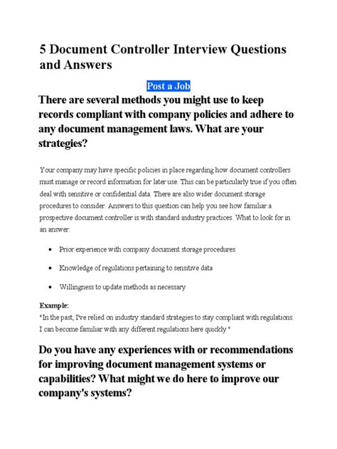 Sample Interview Questions And Answers For Document Controller - Questions & Answers. By properly preparing for an interview to work as a controller, you can help to ensure that you're able to answer their questions with accuracy, tactfulness and confidence. I have been a document controller for over six years, specializing in setting up and implementing document control systems.